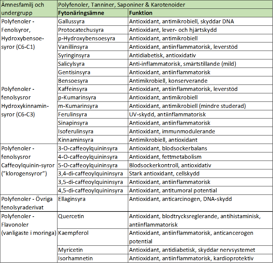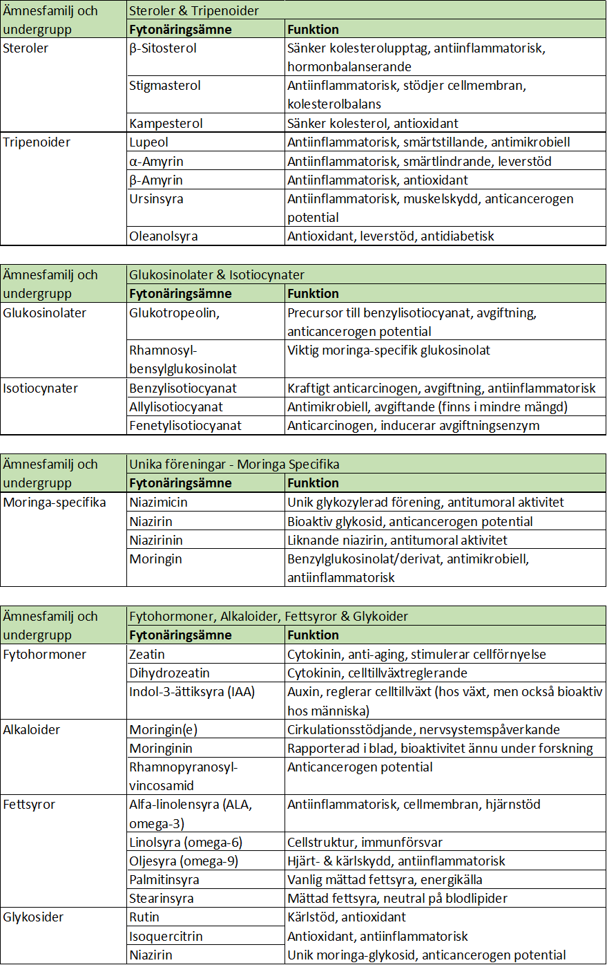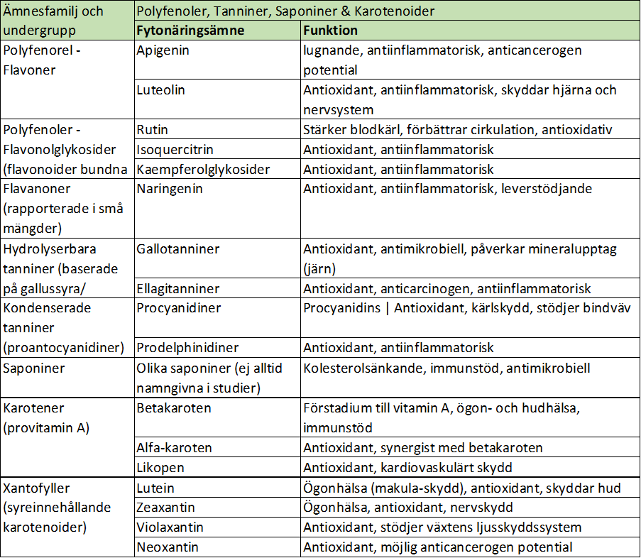 De innehåller detaljerade listor på fytokemiska ämnen, vitaminer, mineraler och deras effekter.